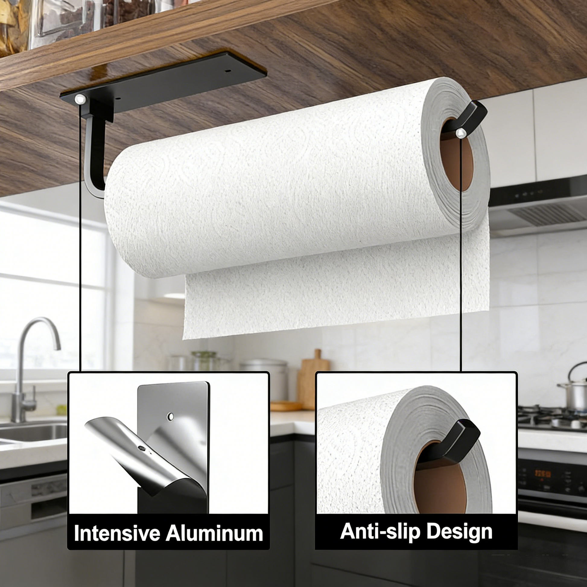Aluminum Paper Towel Holder, Self-Adhesive & Drilling Mount, Horizontal/Vertical Under Cabinet Organizer