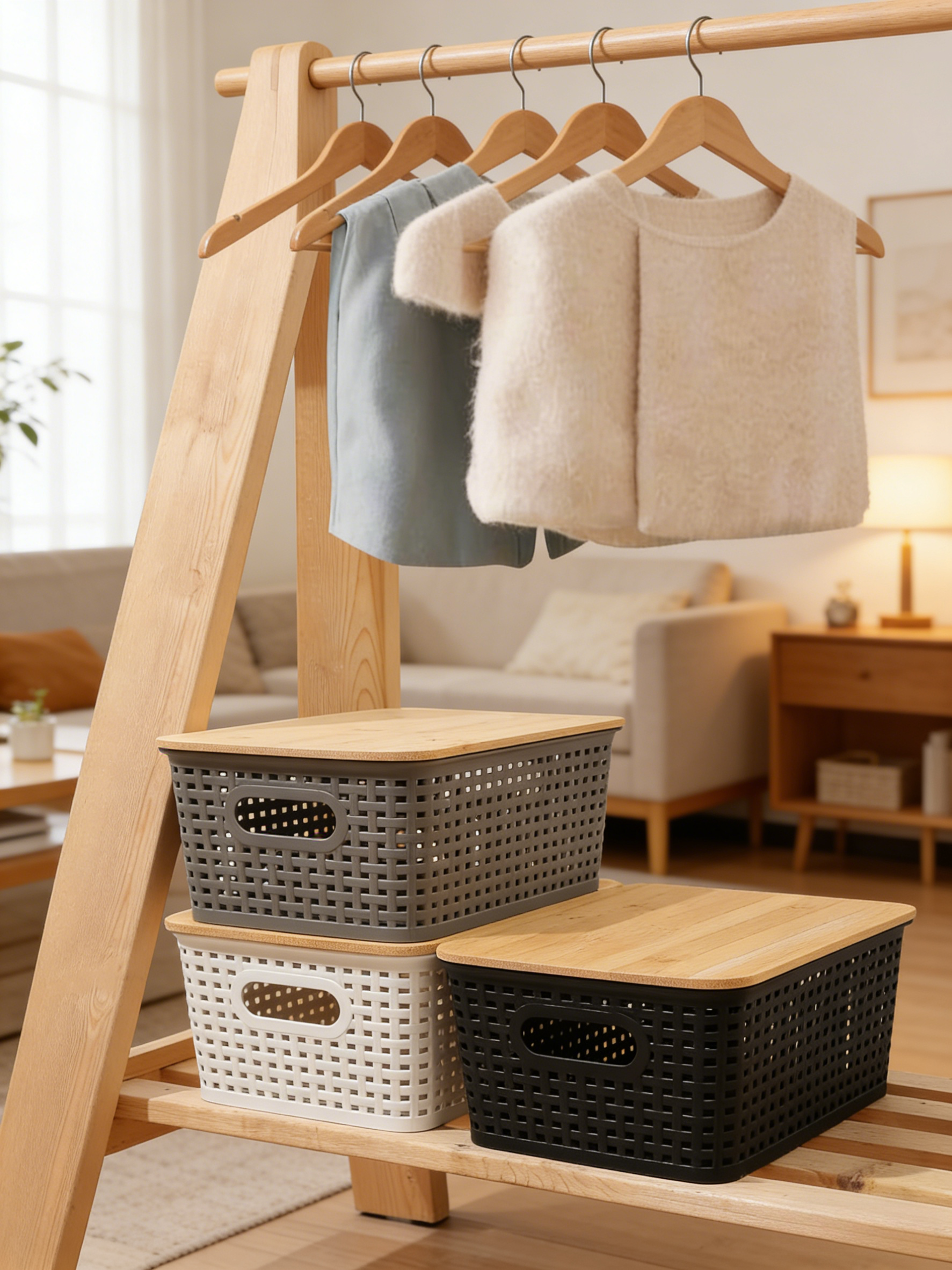 Stackable Plastic Storage Basket with Bamboo Lid, Woven Design Ventilated Organizer for Home & Kitchen