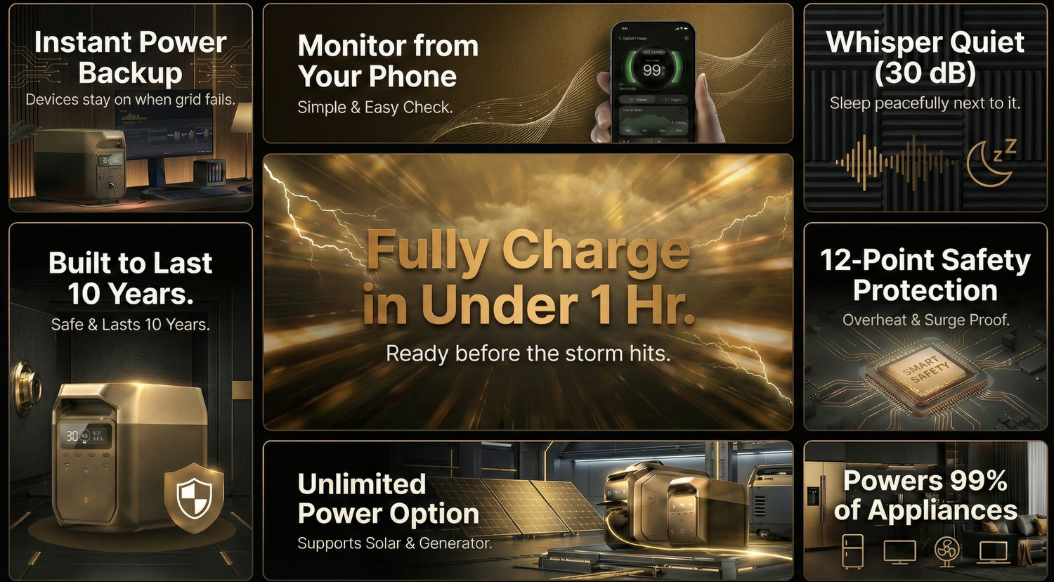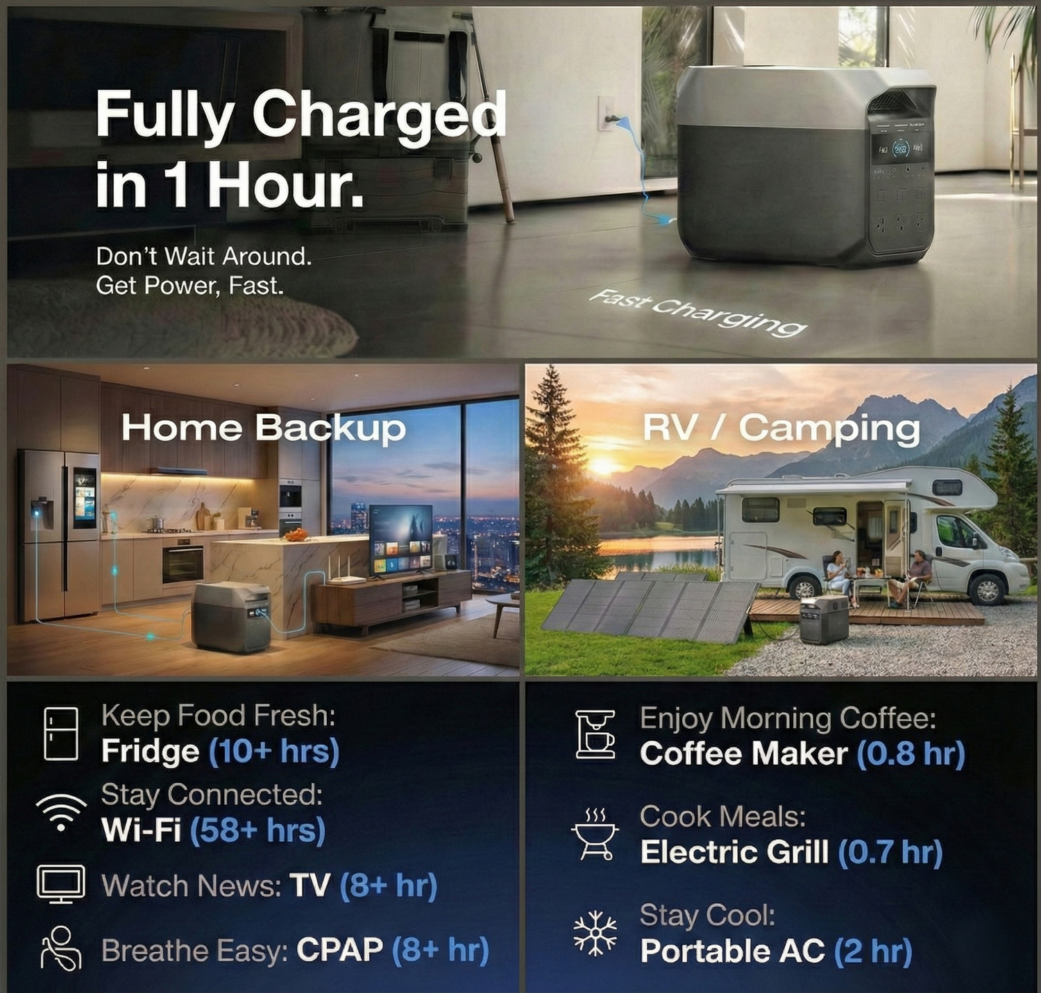 With dual fast charging inputs (400w solar + 1800w AC), it achieves a full charge in just 56 minutes, powering up to 13 devices no matter where you are.